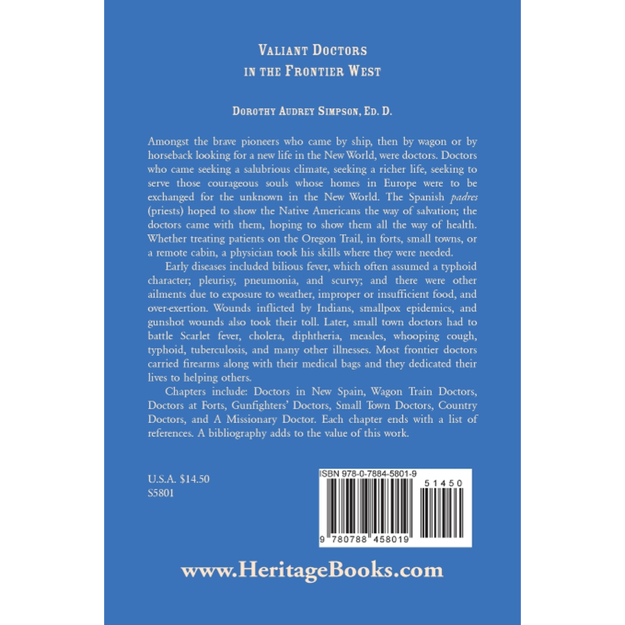 Chapters include: Doctors in New Spain, Wagon Train Doctors, Doctors at Forts, Gunfighters' Doctors, Small Town Doctors, Country Doctors, and A Missionary Doctor. Each chapter ends with a list of references. A bibliography adds to the value of this work.