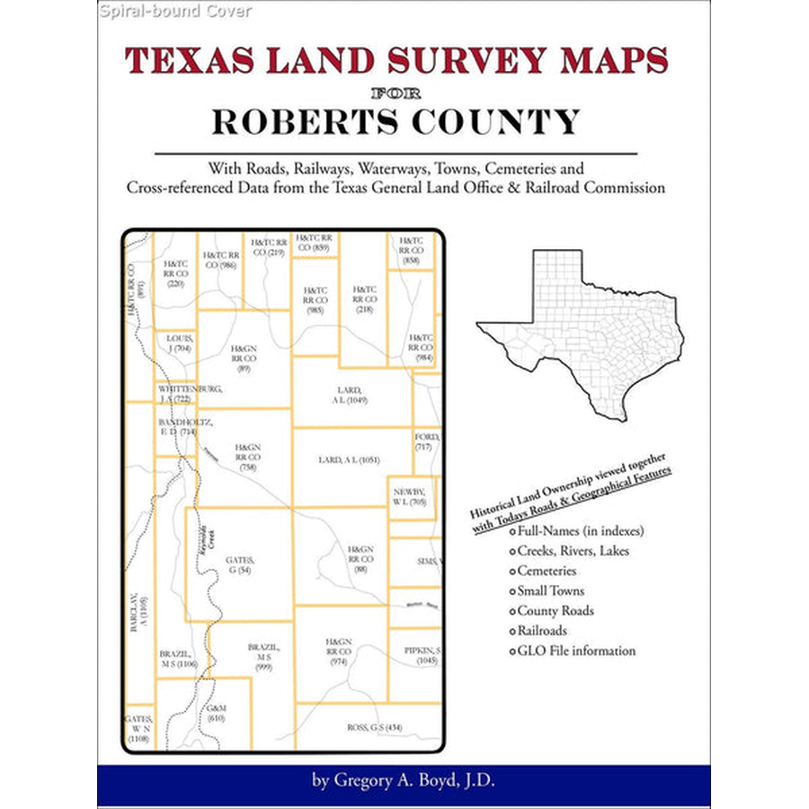 An indispensable book for any researcher interested in Roberts County's history or land (or both), or its first landowners after Texas's Independence from Mexico. Each book in this series is laid out into multiple maps using a 6 mile high by 4 mile wide grid. This book contains 48 Survey maps laid out within this grid. Each Land Survey Map shows the boundaries of original parcels laid out over existing roads, railroads, waterways. These are shown as well as the original Survey-Name and the Abstract Number assigned by the Texas General Land Office to the instrument that gave ownership to that parcel. The book includes an all-name index for everyone mentioned in the maps, as well as supplemental maps showing the location of the county within the state, the surrounding counties, and index maps for the individual land survey maps. Community center points and cemeteries listed in the USGS database are included on the land survey maps.